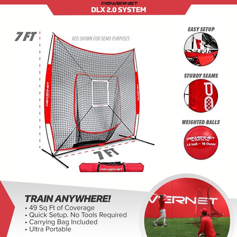 This new bundle includes: our 7×7 DLX 2.0 Hitting Net made for batting practice and various drills. A removable strike zone to help develop pitching accuracy through an added strike zone target. Finally, the included progressive weighted ball system allows a hitter to move up in weight as they build proper form and strength. 3 New Ball Weights – Progress from 12 oz to 14 oz then finish with 16 oz Heavies. It’s similar to weight lifting with heavy ball concept. Progressing heavier or lighter on each hitting set. Our net system stands 7 ft (H) and 7 ft (W) creating a large backstop for a variety of practice drills. The bow frame is designed to flex with the impact of each swing. Each system is completely portable and perfect for in-home training or bringing along to the ball park. We have redesigned our EZ to follow PowerNet Instructions to make set up a cinch.