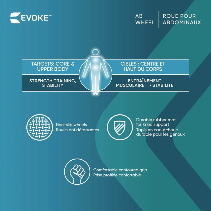 Activate your core with the Evoke Abs dual abdominal exercise wheel. Versatile tool for all fitness levels, it works to strengthen your core and upper body. Dual, non-slip wheels provide stability on most surfaces, and the comfortable contoured handle grips ensure a secure grip as you roll the wheel back and forth. This is an easy addition to your day-to-day workout routine. Evoke mantra is wellness your way. Evoke products work to best support you in your fitness journey and goals towards a healthy lifestyle. Whether it is for your strength training, cardio, flexibility or yoga exercises, Evoke is here to support you in achieving your goals.