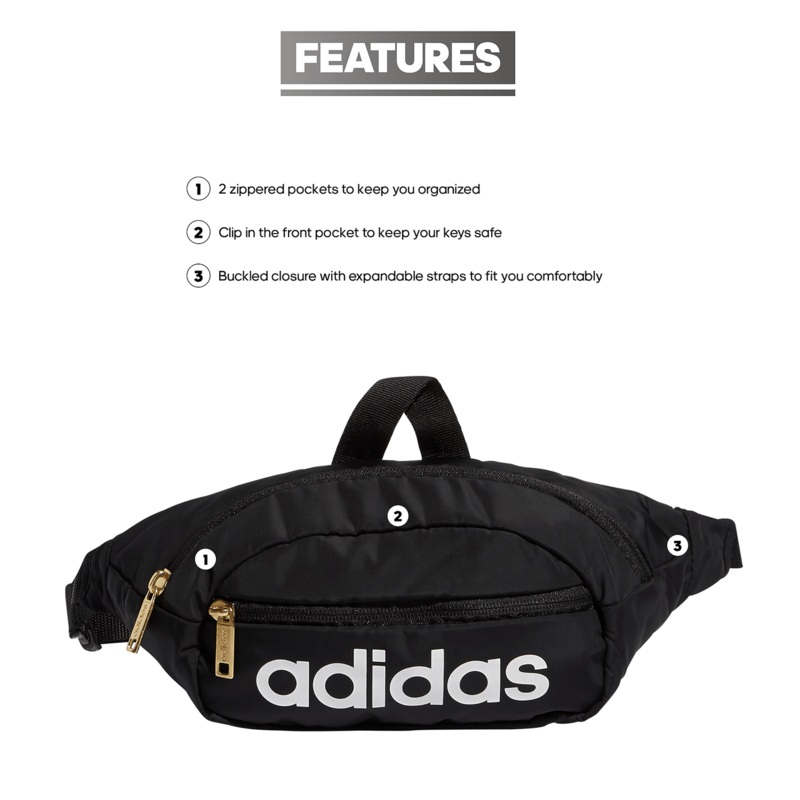Small enough for every day and the right style for anytime wear, this soft waist pack has just enough space for the basics. A bold adidas graphic shares sport-inspired heritage everywhere you go.