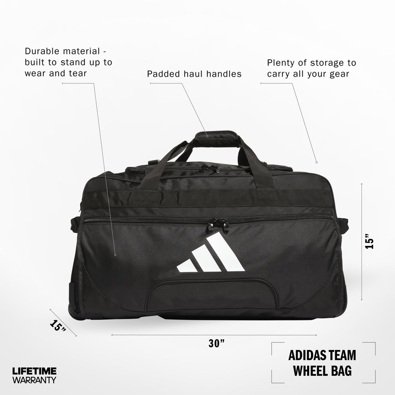 Get the show on the road with this adidas Team Wheel Bag. Made for all-sport functionality, it has built-in caster wheels, so you can easily roll it from point A to point B. It’s durably built to stand up to season-long wear and tear and has lots of storage compartments for all your gear and then some.