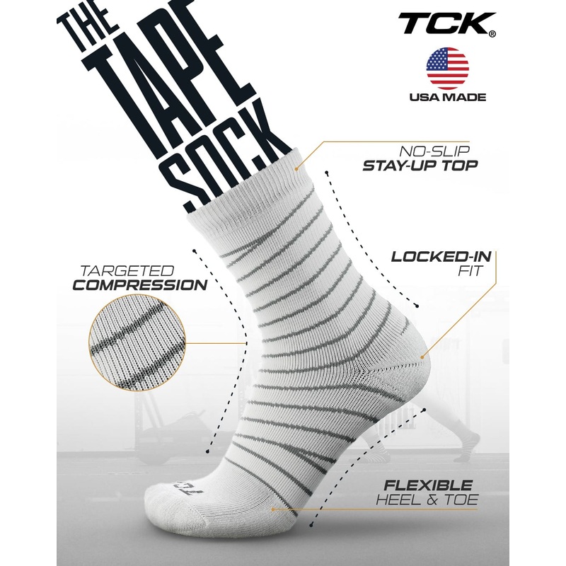 TCK ankle support socks designed to mimic the benefits of taping your ankles. These socks offer robust support for high-impact sports like basketball, football, tennis and more. These compression socks offer firm support, maintain a comfortable fit and flexibility, allowing a full range of motion for running, jumping, and quick direction changes. Crafted from high-quality, breathable material, these socks keep your feet cool and dry. Made in the USA. TCK was founded in 1961 in North Carolina.