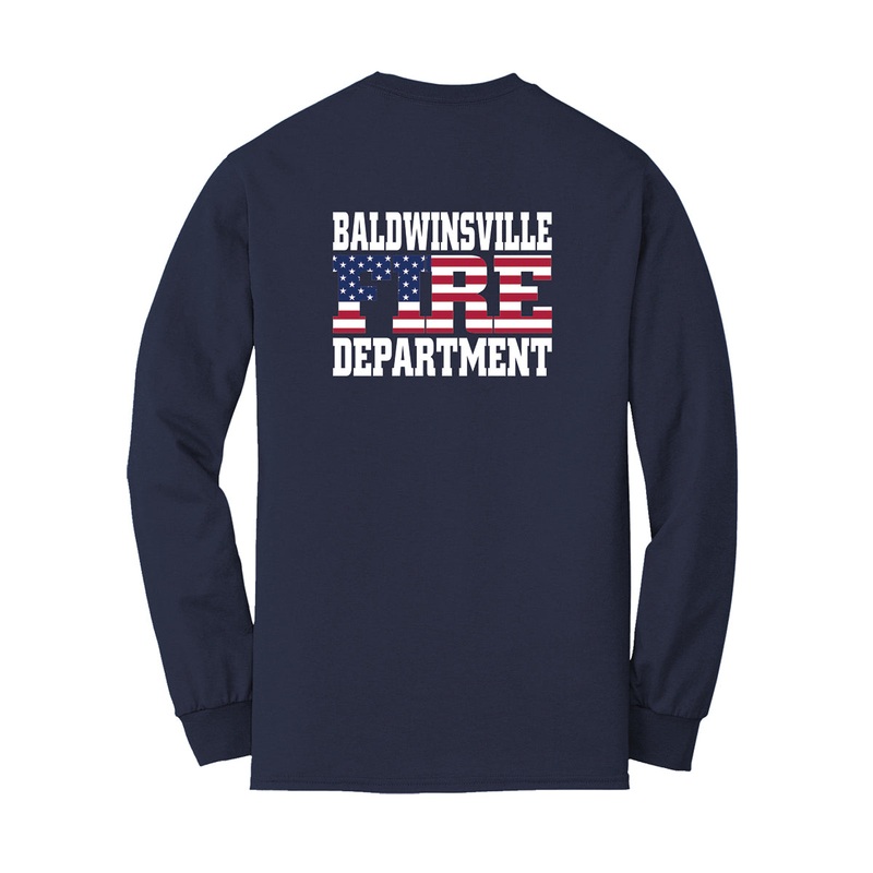 B’ville Fire Dept. 50/50 Blend Long Sleeve navy blue shirt with full-color logos on the front and back.