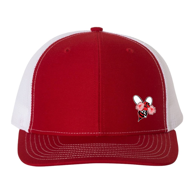 B’ville Pop Warner CHEER Snapback Trucker Hat in Red/Gray, Red/White, and Red/White/Black. Embroidered logo on side of hat.