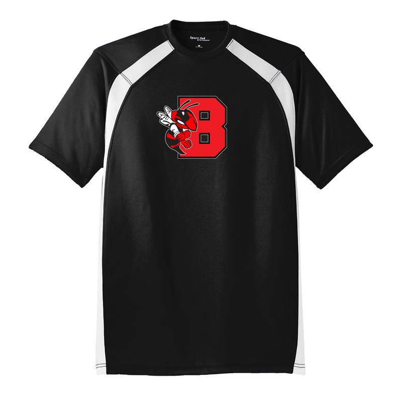 Moisture-wicking, odor-fighting performance with colorblock side panels, raglan sleeves and set-in construction on the back for easy movement.