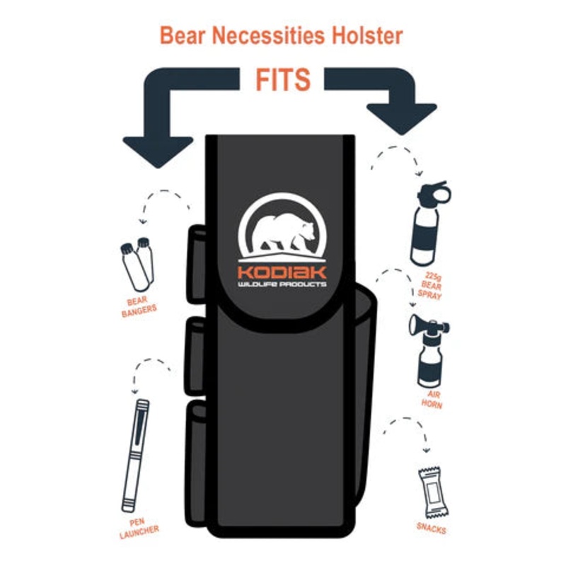 This bear spray holster holds your Frontiersman or Sabre 225g bear spray, 42.5g Kodiak Wildlife Deterrent Horn, 2 Tru Flare Bearbangers and Tru Flare Pen launcher. Side pocket can be used to carry a 42.5g horn or extra Flares or Bearbangers.