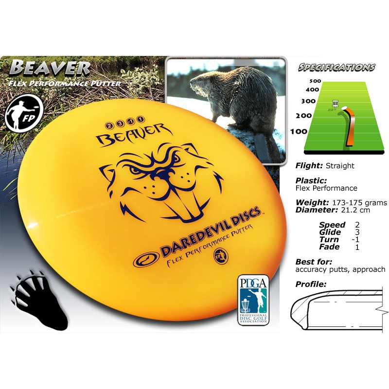 Made from our durable flexible plastic. The Beavers shape allows for very stable straight putts and is perfect for short to medium approach shots. You will always score with a beaver!