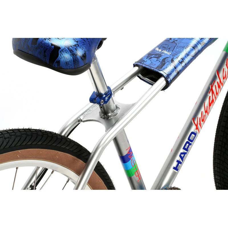 In 1982, Bob Haro created the world’s first freestyle specific frame, aptly named the Haro Freestyler. 40 years later, we pay homage to its iconic twin top tube design and timeless aesthetic. The Haro 26″ Freestyler is updated with a highly polished aluminum frame, matched with 4-piece chromoly bars and forks, all with the original Haro livery. The rest of the bike is built up with our very own Legends CNC-machined sprocket, Fusion pedals, and Bob’s original artwork on the saddle and the included pad set. If you’re a fan of Bob, Haro Bikes (or both), this is the bike for you.