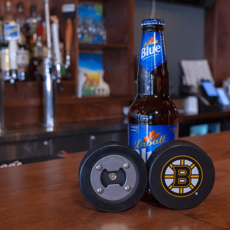 Each licensed souvenir puck is purchased from Sher-Wood in Canada. We then modify the puck into a bottle opener. Our built-in magnets will catch flying bottle caps, saving you from searching the room each time you open a drink. It also doubles as a coaster!