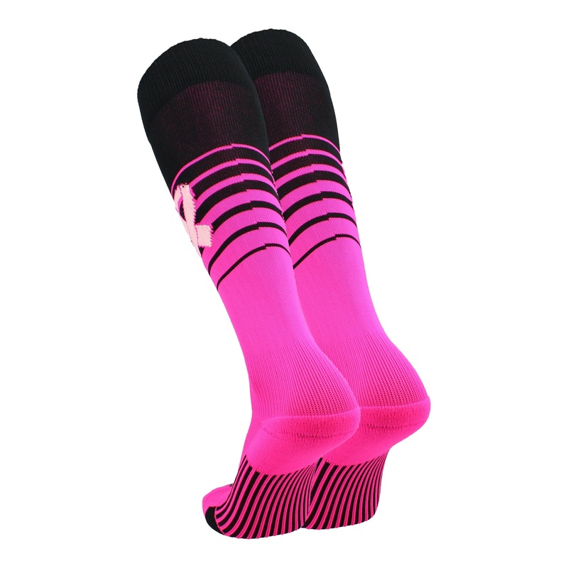TCK Breaker Aware Breast Cancer Awareness Over the Calf Socks. These tall breast cancer awareness socks feature a pink ribbon and a faded striping pattern. Made for girls or boys for softball, football, baseball, soccer, field hockey, basketball, lacrosse, volleyball, wrestling, and more!