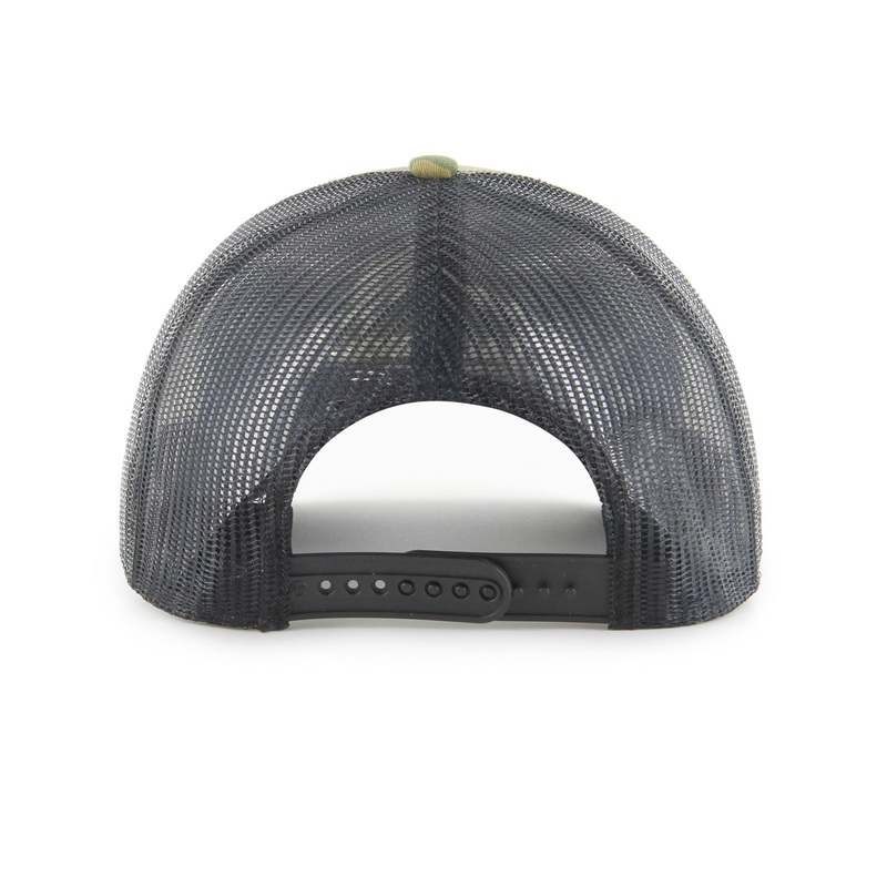 The Edmonton Oilers ’47 Camo Mesh Trucker Snapback Hat has a comfortable mid-crown, a curved visor, and an adjustable plastic snapback. The front has an embroidered black and white Oilers logo. Made from garment washed cotton twill and hard mesh.