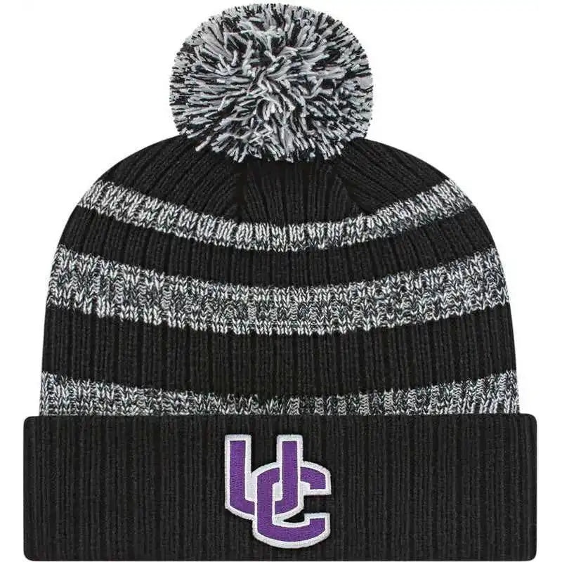 100% acrylic knit cap with solid color cuff with either a two-color or three-color pom