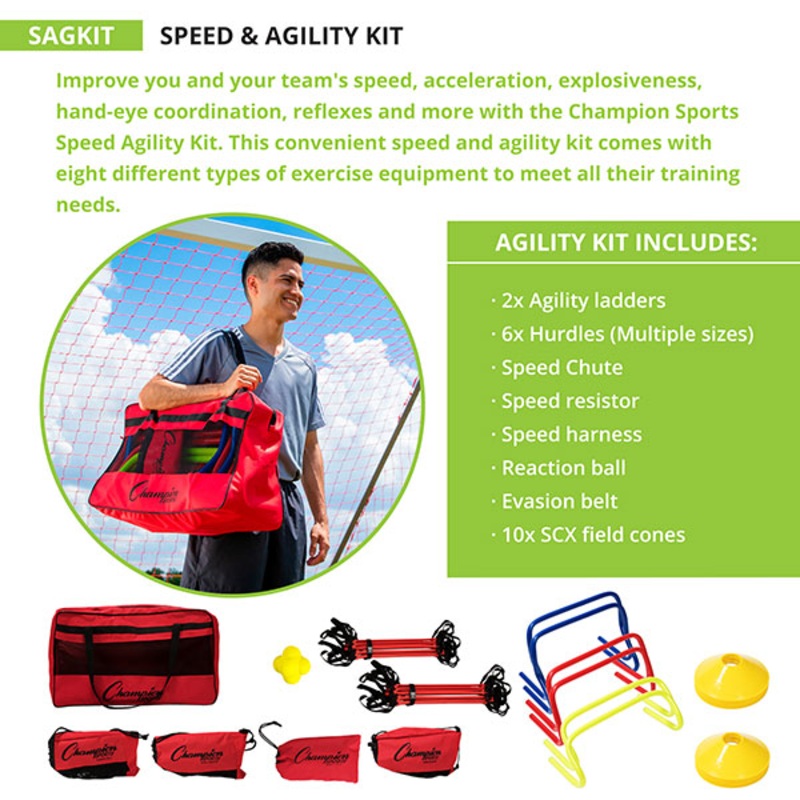 • The convenient speed and agility kits comes with eight different types of exercise equipment to meet all training needs and a variety of drills. Agility ladders help to improve lateral agility, foot speed, and coordination. Hurdles increase knee lift height, foot speed, and coordination. Speed chute helps athletes maximize top running speed. Speed resistor and speed harness require a training partner to apply resistance, helping to improve speed, acceleration, and explosiveness. Reaction ball randomly bounces off of any hard surface it touches, improving reaction speed and hand-eye coordination. Evasion belt develops short-space explosive speed, agility and react. Field cones can be used for a variety of drills. Improve you and your team’s speed, acceleration, explosiveness, hand-eye coordination, reflexes and more with the Champion Sports Speed Agility Kit!