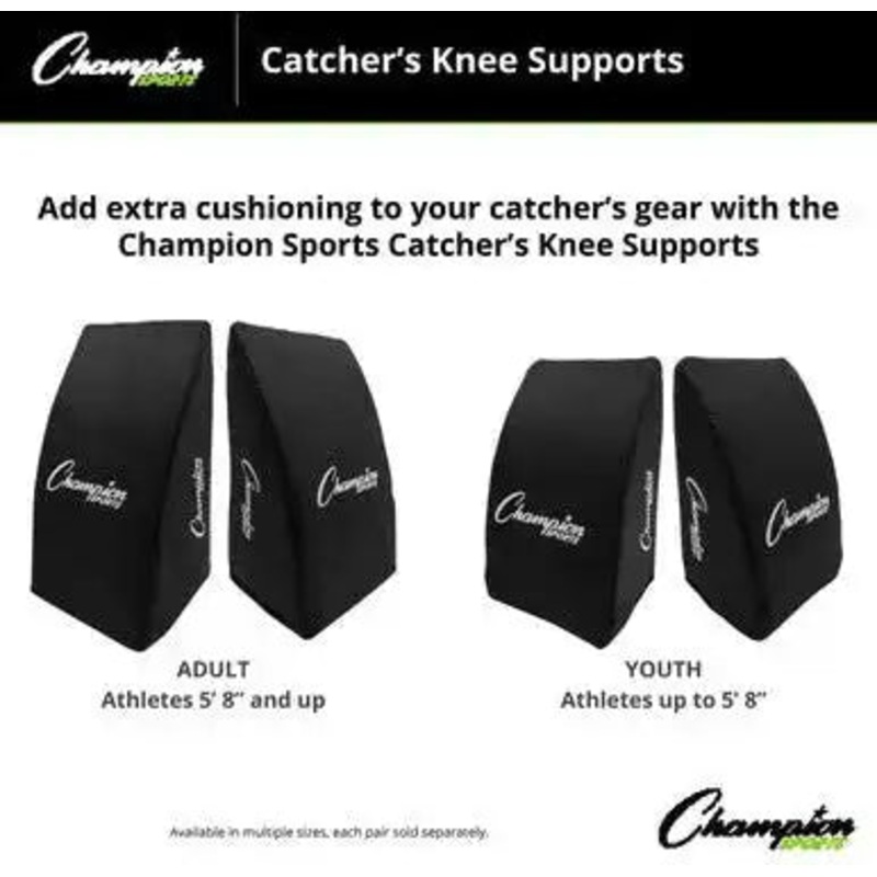 Add extra cushioning to your catcher’s gear with the Champion Sports Adult Catcher’s Knee Supports. The soft, lightweight cushioning of these knee supports help to reduce the strain put on the player’s back and knees, and the supports are tough enough to maintain their shape even after frequent use. Recommend for adult players 5’8″ and taller, these catcher’s knee supports are a great addition to any high school, college or club’s equipment room.