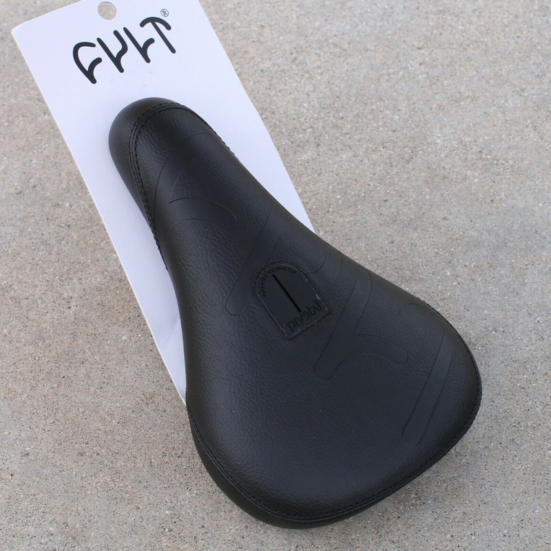 The Cult pivotal seat features a thick foam padded base with cover with a large Cult logo across the top panel and a hollow pivotal bolt for weight savings