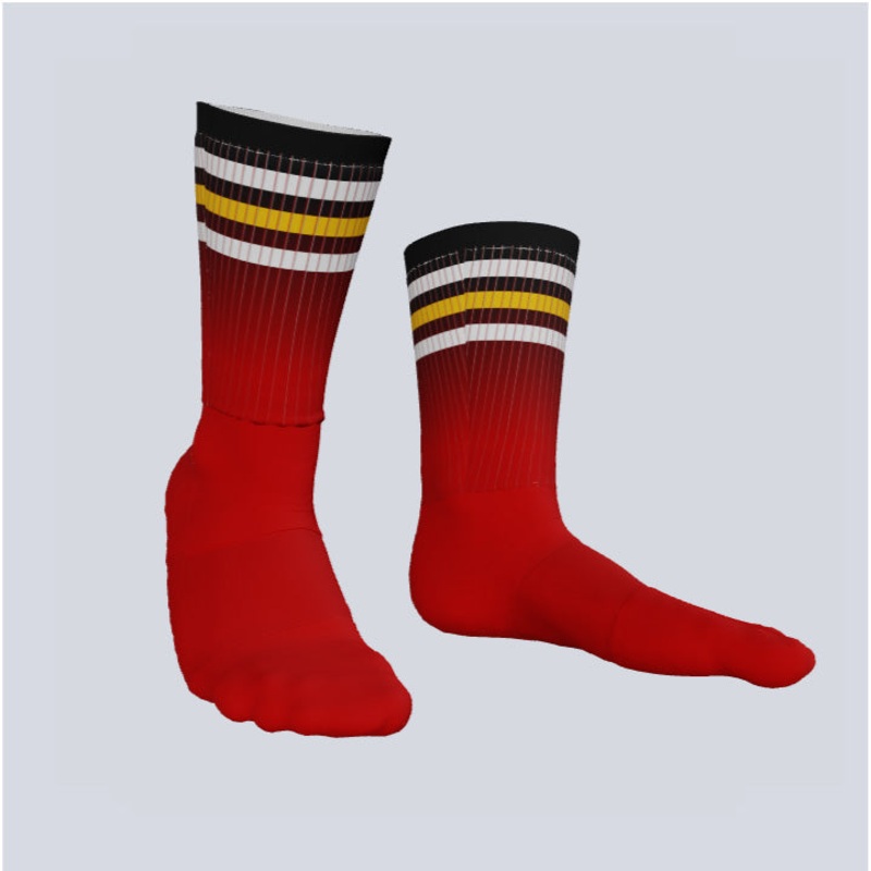 Stay comfortable and collected on the field with our high-performance sublimated socks. These game socks are designed to wick away moisture and resist odors, ensuring you stay dry and comfortable all game long. With Gear Team Apparel sublimation technology, you can effortlessly create a personalized look that will endure over time. Your team’s colors will remain vivid even after numerous washes and wears, while custom elements like logos, names, and numbers will never crack or peel as they are seamlessly integrated into the garment.