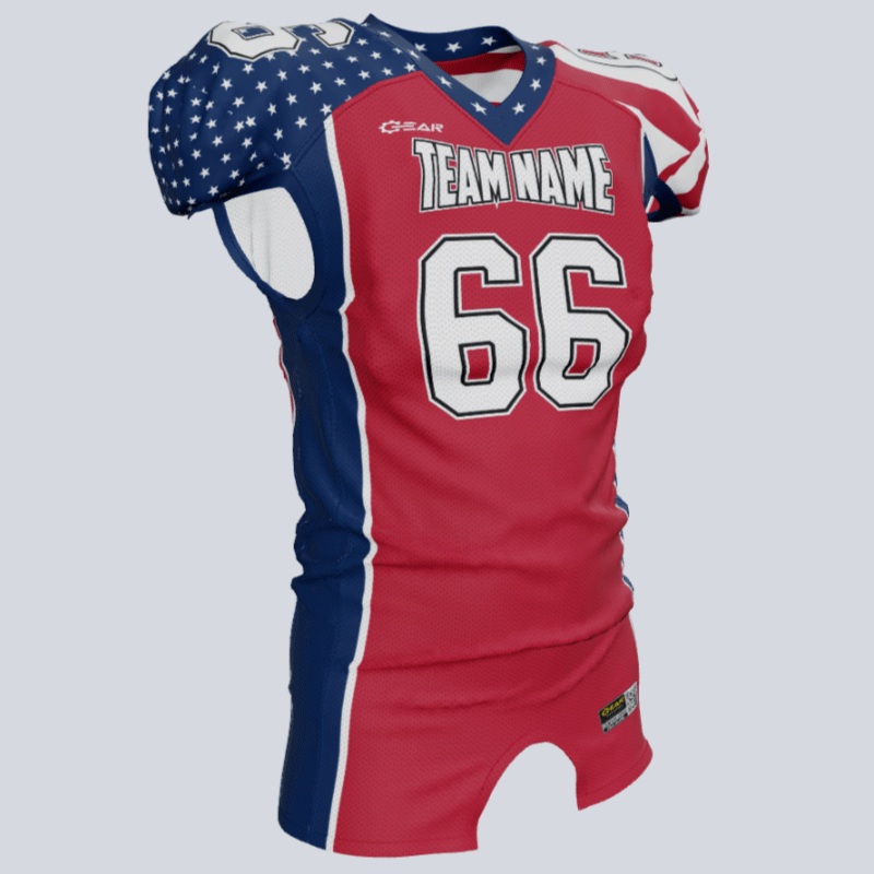 Celebrate your stars and stripes with our “Team America” Lineman Fitted Custom Football Jerseys. They’re fully customizable to reflect your team, club, or school’s unique style. With advanced moisture-wicking technology, investing in this jersey is like voting for victory. Let your design freedom ring, creating a look that’s all your own, and watch as your team’s performance rises like a bald eagle to the next level.