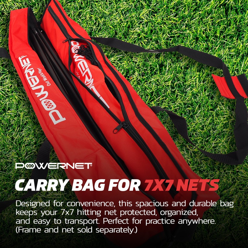 - CARRY BAG FOR 7×7 NETS: PowerNet Deluxe Carry Bag is designed to hold a 7×7 foot baseball or softball hitting net (frame and net sold separately). A spacious, convenient storage solution for keeping your equipment protected and ready for practice. NOTE: This bag does NOT fit the PowerNet 1030 7×7 PRO Frame (square tubing)