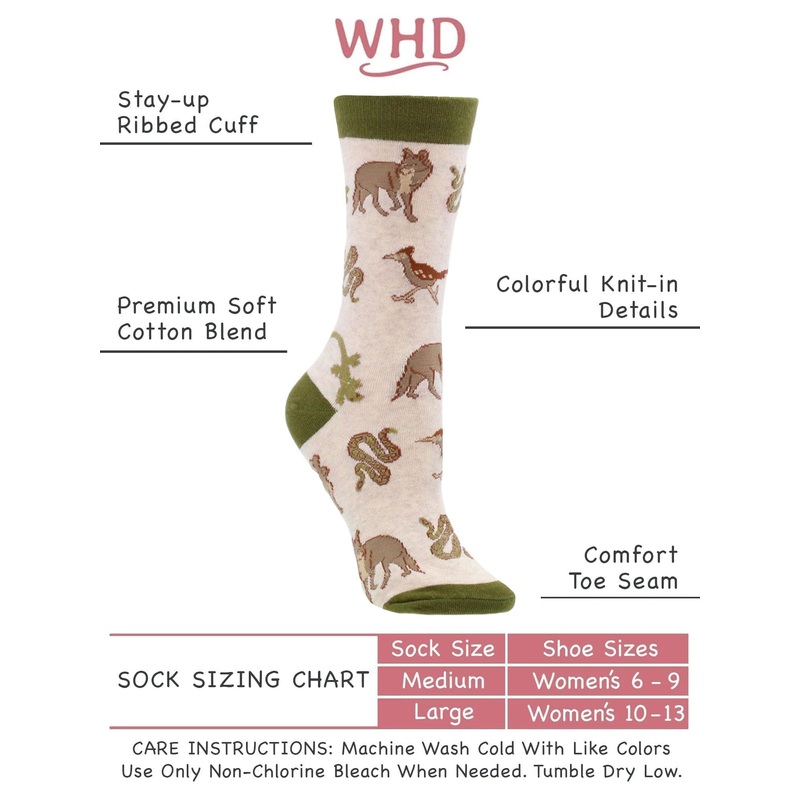 • PERFECT FOR ANIMAL LOVERS – Snakes, Lizards, Geckos, Coyotes, and Roadrunners, all of these amazing creatures make the the desert their home. Feel the spirt of the desert when wearing our Desert Animal crew socks featuring an all over animal pattern.