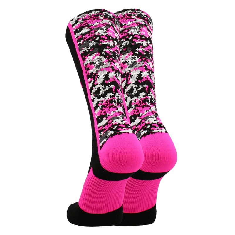 - HIGH PERFORMANCE AWARENESS SOCKS: Support Breast Cancer Awareness with these athletic crew socks. These socks hit mid-calf and featurea black and pink digital camo design on the back with a pink ribbon on the front. These socks are great for boys or girls and are ideal for football, basketball, volleyball, cheer, wrestling, lacrosse, flag football and more!