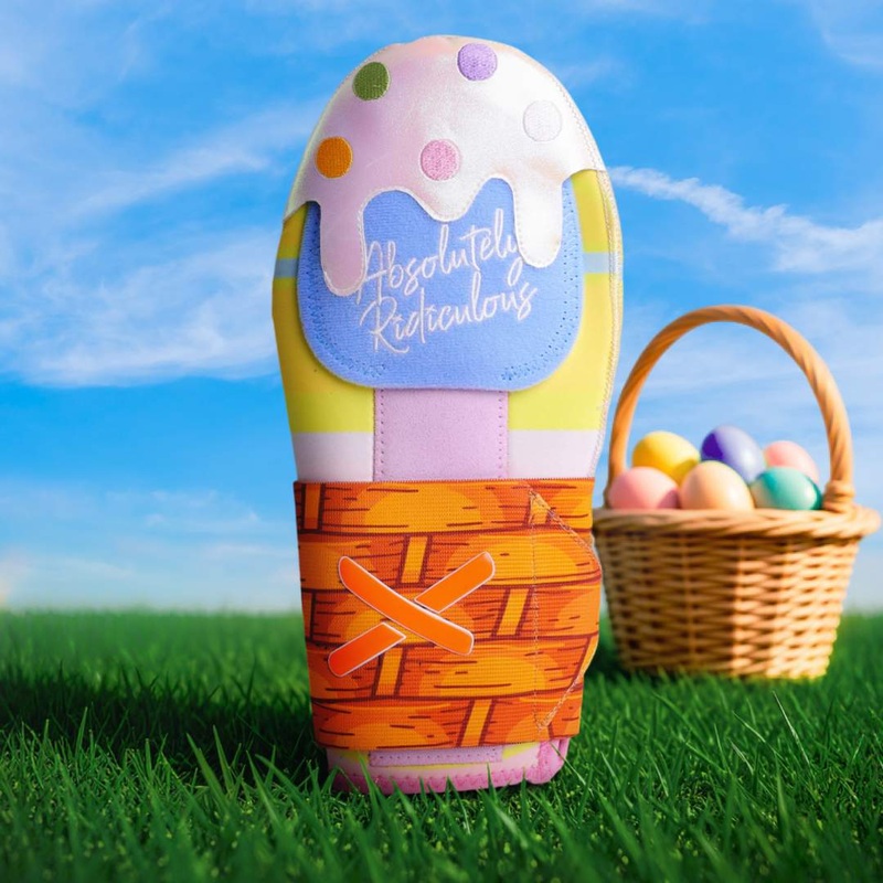 Sliding mitt features an Easter basket strap, dyed Easter egg color-way, and an iridescent drip for a subtle and unique color at every angle.