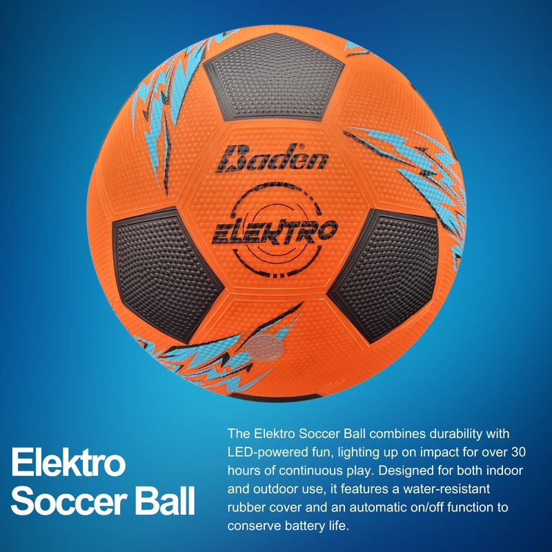 The Elektro Soccer Ball is built for durability and fun, featuring Badens water-resistant deluxe rubber cover and raised seams for enhanced longevity and playability. With a simple bounce, touch, or kick, the ball instantly activates its energy-efficient LED light, providing over 30 hours of continuous glow for nighttime or low-light play. The automatic on/off function helps conserve battery life by shutting off after 30 seconds of inactivity, ensuring extended use. Designed for both indoor and outdoor recreational play, the Elektro Soccer Ball comes ready to use with batteries included.