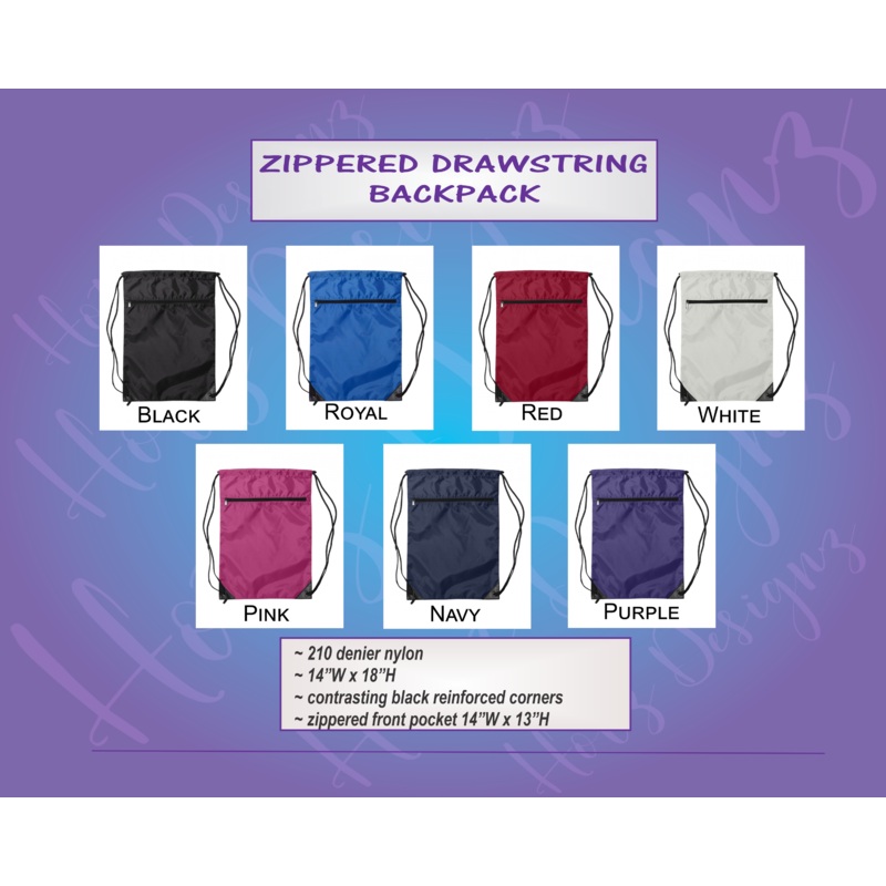 - zippered front pocket 14″W x 13″H
