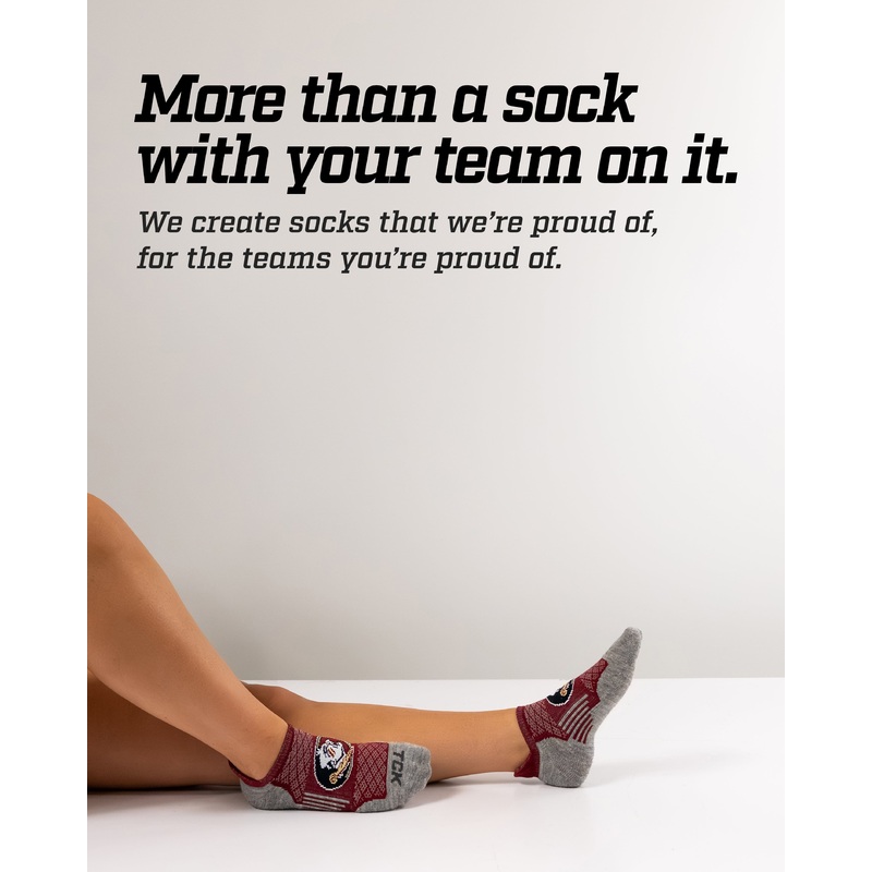 Step up your sock game with TCK’s Florida State Seminoles no show socks, high performance NCAA sock made in the USA. Designed for sneakerheads, golfers, runners, and fans alike, these socks feature a soft merino wool footbed, breathable mesh upper, arch support, and a smooth toe seam. The heel tab protects without showing. Perfect for all-day comfort, year-round wear, and gifting for birthdays, Father’s Day, grads, or Christmas.