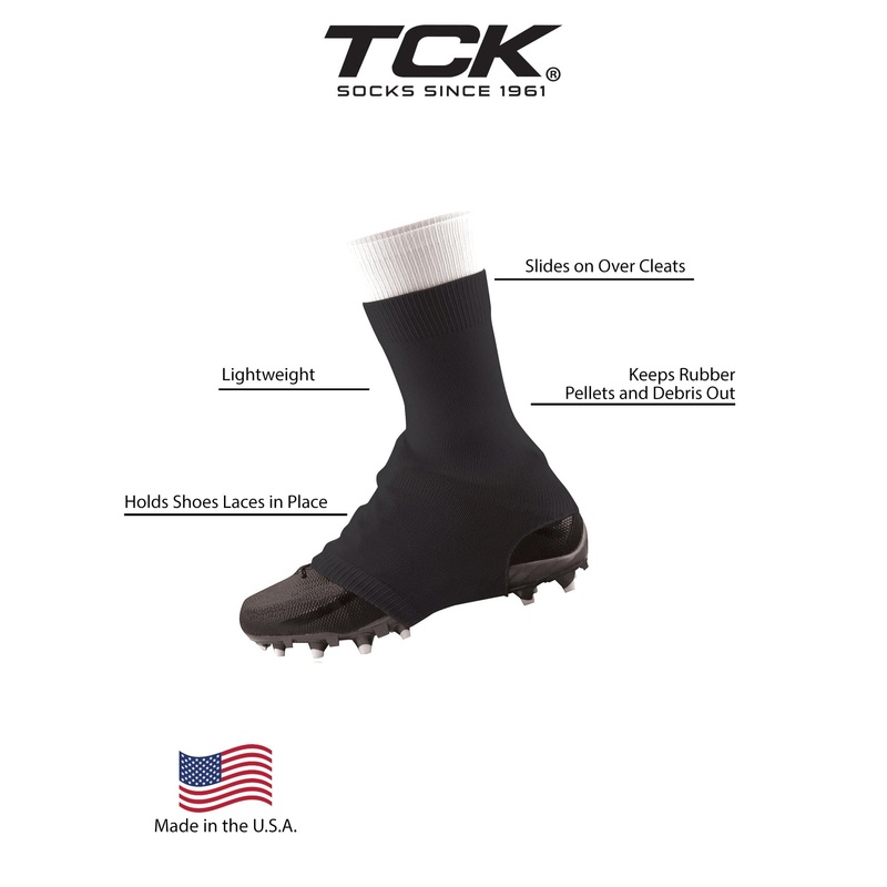 TCK Football Spat Cleat Covers Debris Inhibitors. High performance Razur style football spat wrap cleat clovers for all field sports and elite athletes.