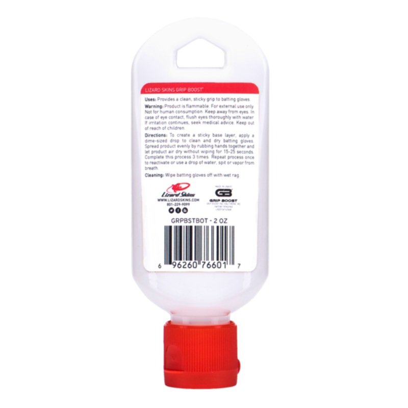 The Lizard Skins Grip Boost batting gel is a quick drying, alcohol-based gel that gives batters the extra grip and superior bat control they need without the mess of other grip enhancers. It works by applying a thin tacky polymer layer to the palm of the glove. Its clear, easy to clean and doesnt leave any residue. Performance is not dependent on temperature and the tackiness can be reactivated by moisture.