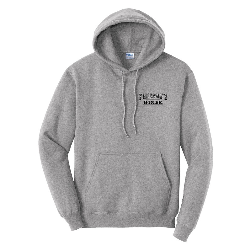 “Hemingway’s Diner” Sport Gray Pullover Hoodie w/ left chest and full-back designs. Adult unisex sizes available.