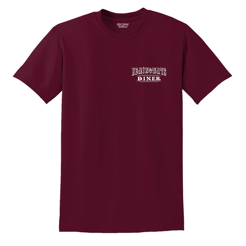 “Hemingway’s Diner” Maroon T-shirt w/ left chest and full-back designs. Adults unisex sizes available.