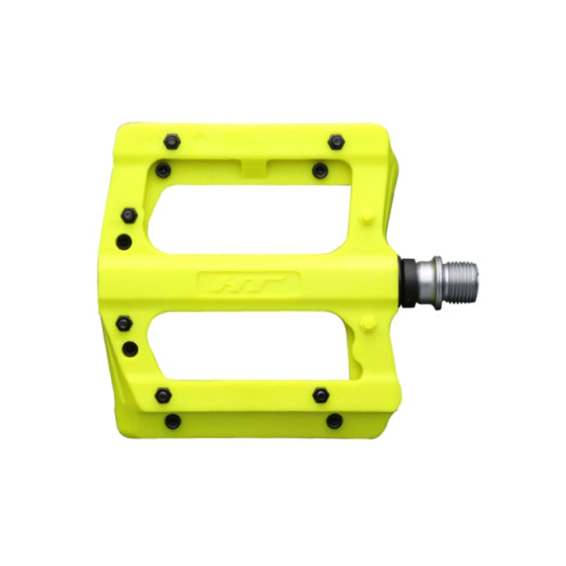 Flat Pedal: Colored nylon and fiber body with replaceable steel pins. Chromoly axles with two sealed bearings and a DU bushing.