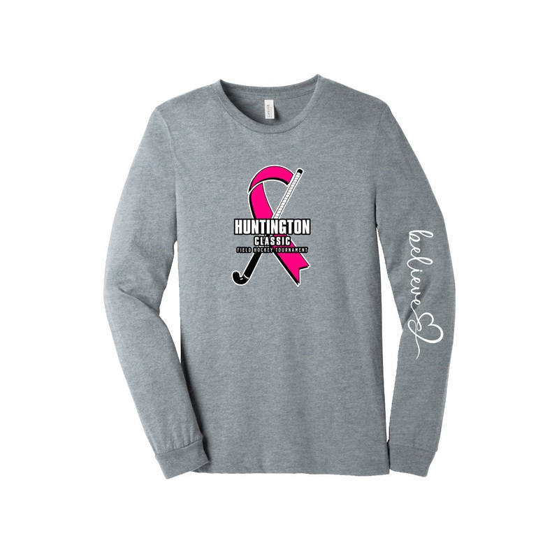 Huntington Classic Unisex Long Sleeve Shirts in black heather, athletic heather, deep heather, and solid white. Logos printed on the front, left sleeve, and back.