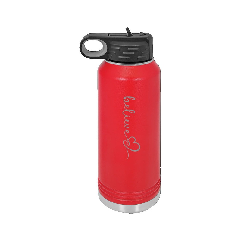20oz Insulated & Laser-Engraved Water Bottle w/ BELIEVE logo. Comes in black, white, and red!