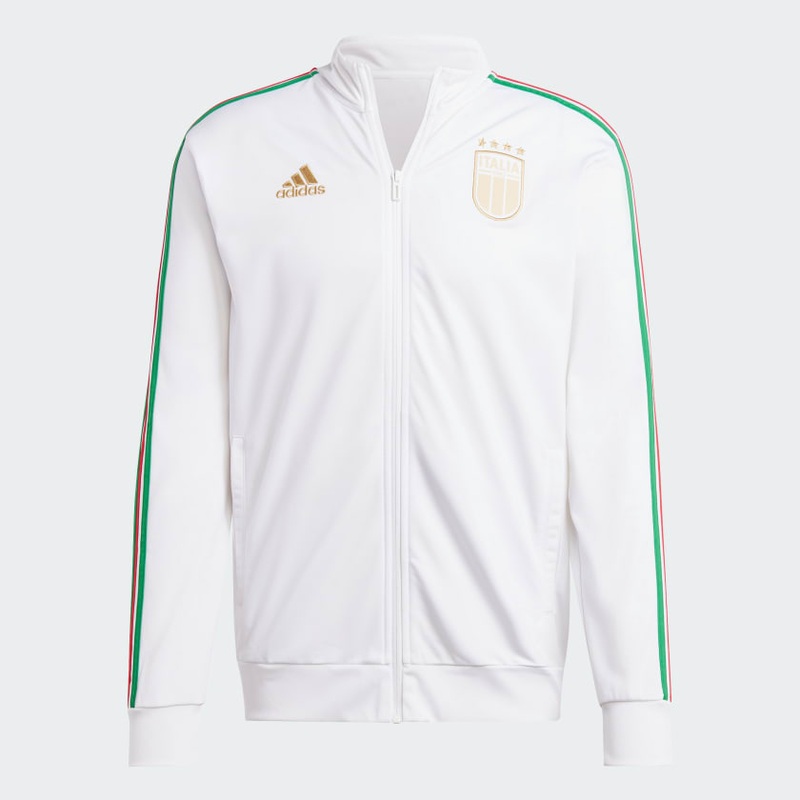 Honour your on-pitch heroes in classic football style by zipping up this Italy track top from adidas. Ribbed cuffs and a stand-up collar deliver a traditional feel. Those 3-Stripes down the arms come in the colours of the nation’s tricolour flag to underline your commitment.
