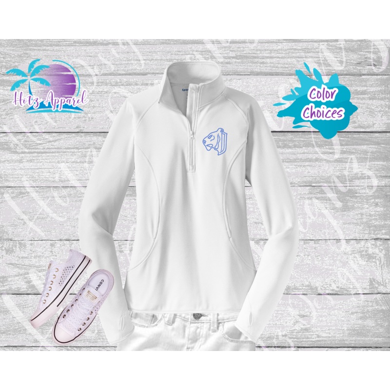 This sporty dri-wick stretch Sport-Tek 1/2 zip pullover is embellished with a rhinestone design that is sure to sparkle. With a comfortable cadet collar, raglan sleeves with thumb holes and a hidden front pouch you’ll want to add this jacket to your athletic wardrobe.