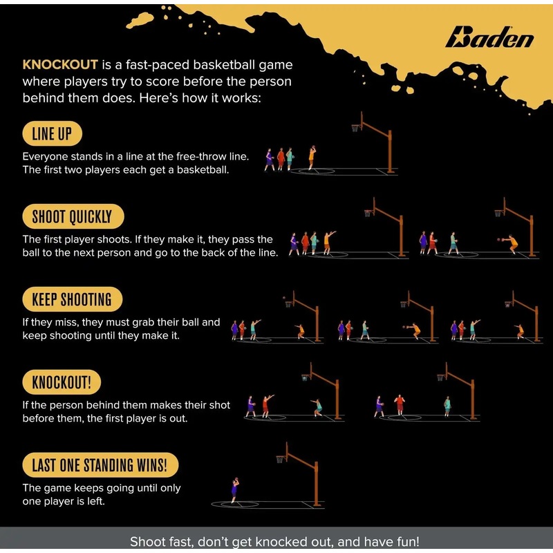 Start the Game: The first player shoots. If they make the basket on their first try, they pass the ball to the next person in line and go to the back of the line. If they miss, they must quickly rebound and continue shooting until they make a basket.