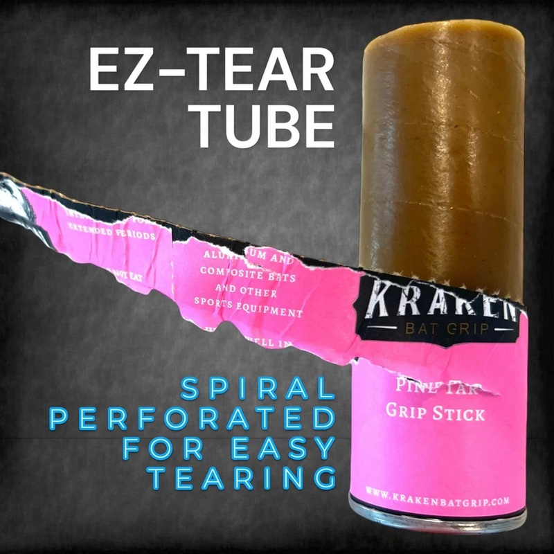 For those that want the world’s best pine tar in a traditional paper tube but hate struggling to get it to tear just right, we created our EZ-Tear paper tube… the only paper tube that is spiral perforated the entire length of the stick for easy tearing. Like all our grip sticks, comes with a Kraken pop-top carry case at no extra cost. No more lame plastic baggies to protect your stick and baseball gear.