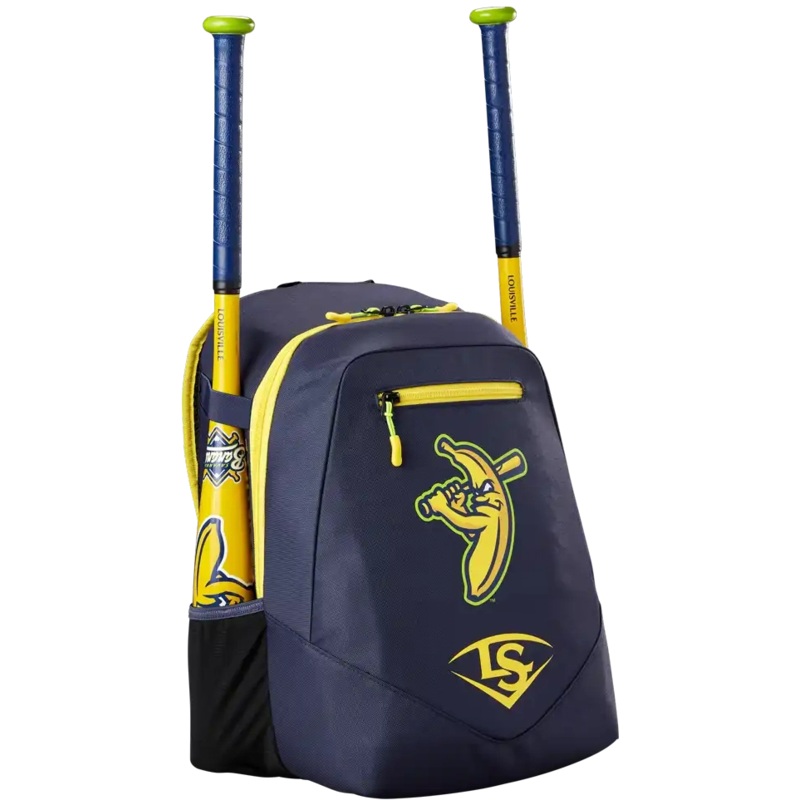 Help your young ballplayer fall in love with the game with the Savannah Bananas Powerized Stick Pack. Inspired by the Savannah Bananas and their brand of Banana Ball designed to entertain always, this Navy Blue and Banana Yellow bag’s large main compartment fits a helmet, glove and more. Two mesh sleeves on the sides can carry bats or water bottles, and the foam padded shoulder straps keep your player comfortable on the walk to the field.