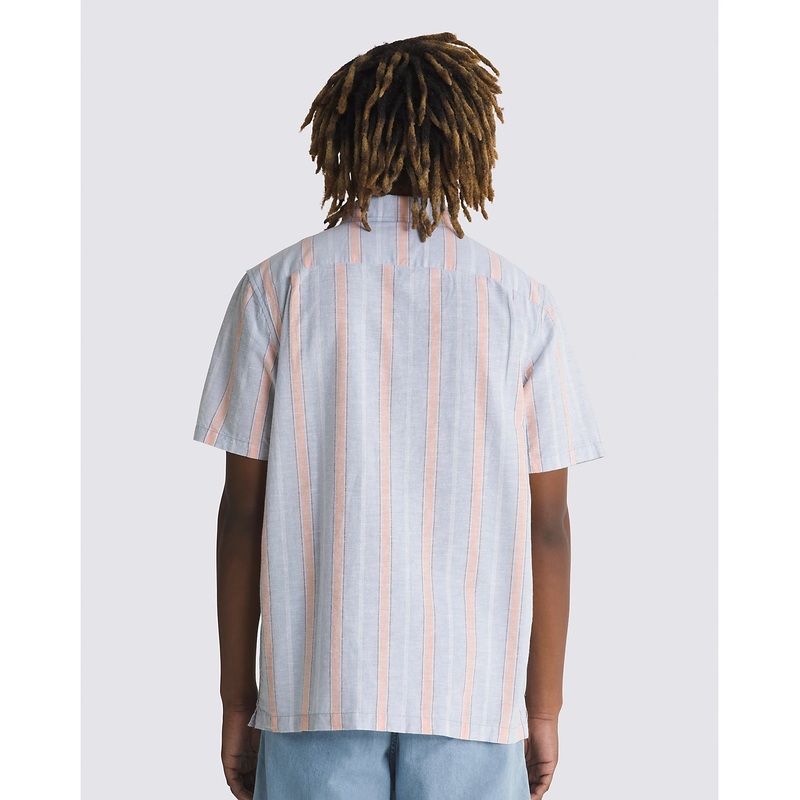 The Carnell Buttondown Shirt is a short sleeve linen woven shirt featuring full buttondown front, tonal vertical stripes, and front left chest pocket with clip label.