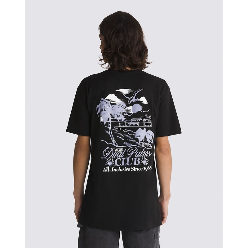 The Dual Palms Club T-Shirt is a short sleeve crewneck tee made from a heavier weight cotton and features the Vans logo on the front and sun, surf, and palm tree scene on the back.