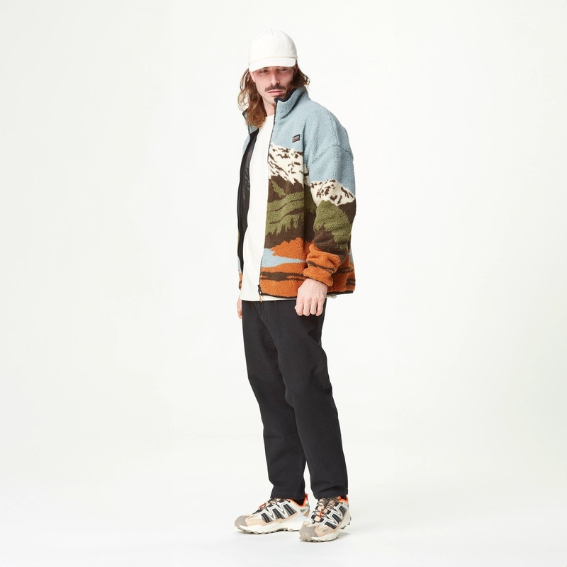 Bold outdoor-inspired jacquard sherpa fleece jacket.