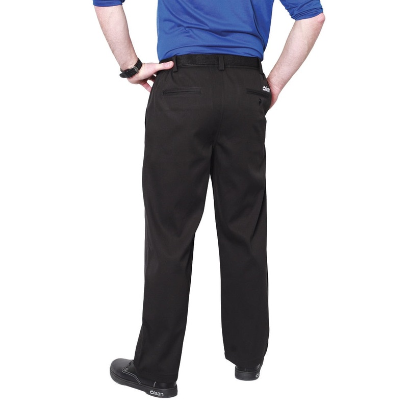These wrinkle-resistant black curling pants have a flat, seam-free front and feature two hip pockets, and a zip fly with button closure.
