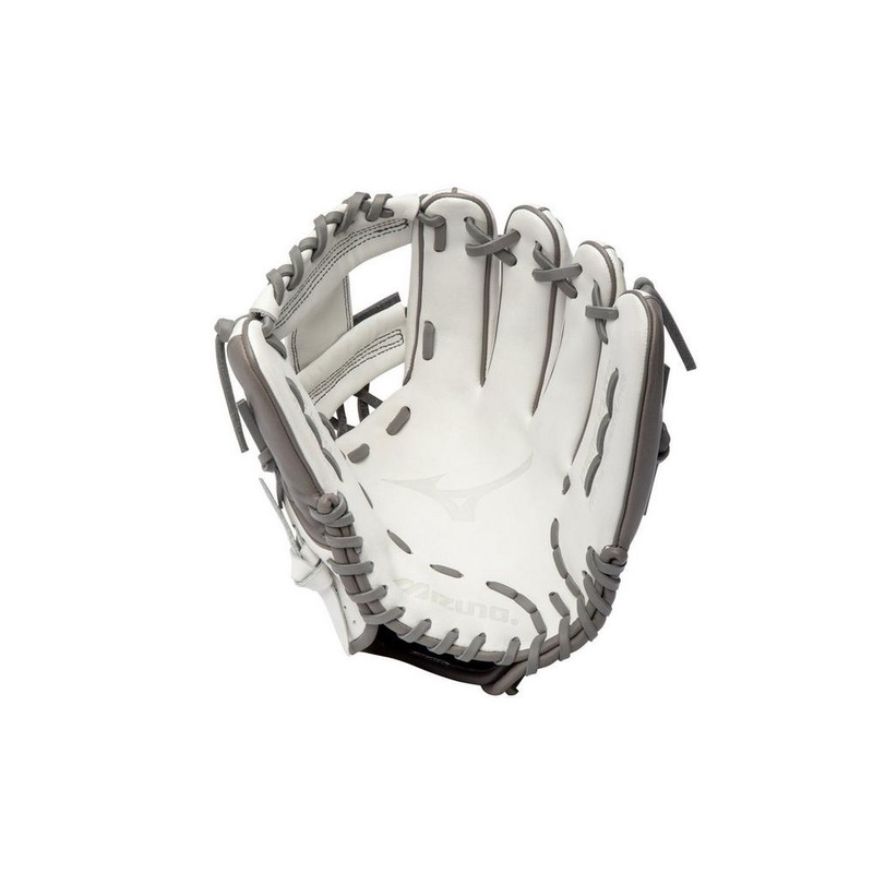 The new Mizuno Prime Elite 11.5″ Infield Glove series is crafted with soft, smooth, white and grey colored leather that is durable with a premium feel. Featuring an UltraSoft Pro Palm Liner for a soft feel and finish. A perforated thumb and pinky panel design reduces weight and increases breathability. Created with Finger Core technology, which is a new finger stall shape that helps improve flexibility and control when making a tough play, while also providing a more comfortable option for players who prefer to shift their ring finger to the pinky slot. Designed with Fastpitch patterns to make Prime Elite an excellent glove choice for serious players wanting to compete at their highest level on the field.