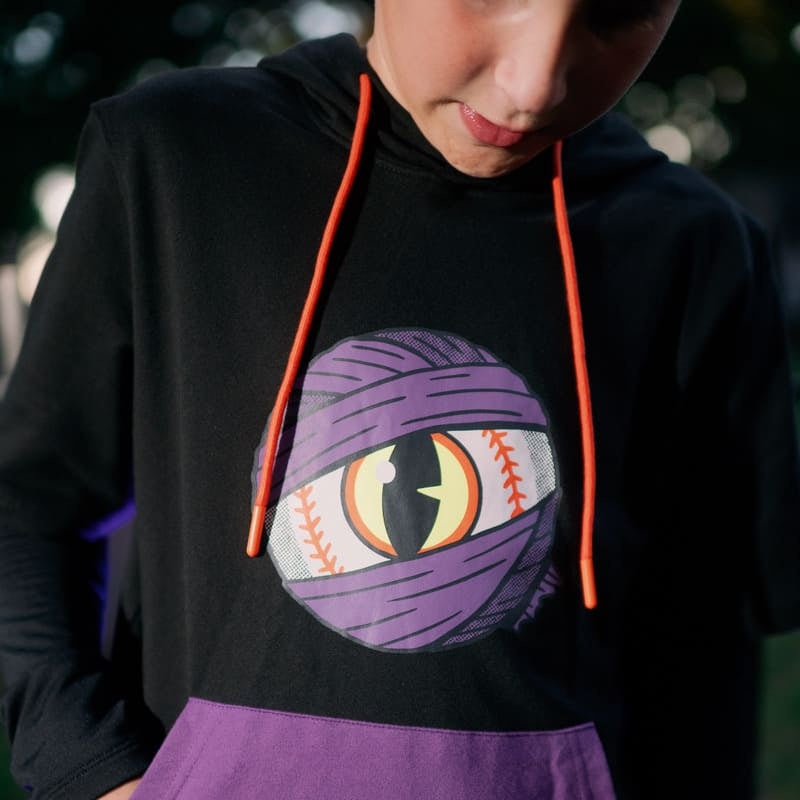 Step onto the field with a look that stares back. The Monster Eye Shoodie from Plate Crates Monster Smash Collection combines creepy-cool style with all-day comfort. Featuring a menacing monster eye baseball graphic, bold black-and-purple color blocking, and bright orange drawstrings, this short-sleeve hoodie is built for players who want to stand out.