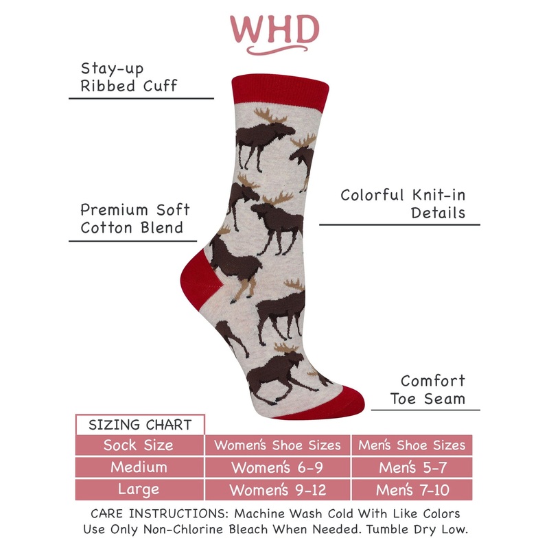 WHD Moose Lovers Socks are made up of 65% Cotton, 20% Polyester, 12% Nylon, and 3% Spandex.