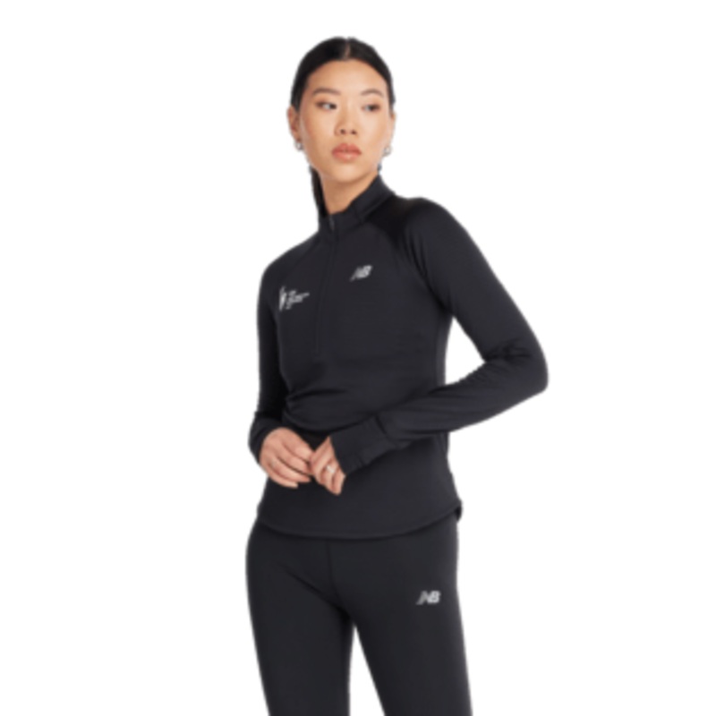 Stay warm during training with the New Balance Women’s NYC Marathon Athletics Heat Grid Half Zip. This high-tech zip-up uses heat grid technology to trap body heat, keeping you comfortable and focused on your performance. Perfect for cold weather runs, this half zip is a must-have for every serious athlete.