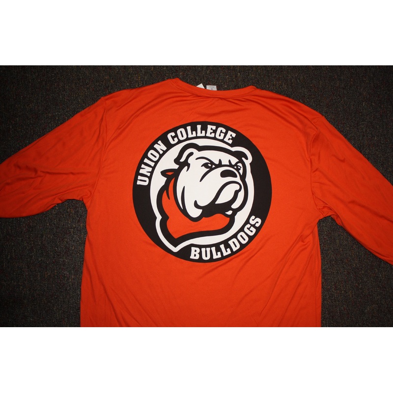 This orange sport shirt has Union College on the front and the circle Union Bulldog logo on the back.