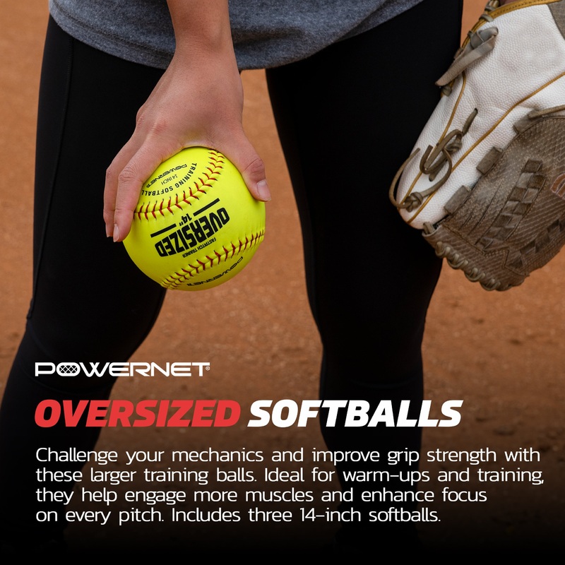 - 14 INCH OVERSIZED SOFTBALLS: The larger-sized ball challenges the pitcher to throw the Oversized Softball with proper mechanics & encourages growth.to work on their grips. Includes three 14-inch softballs