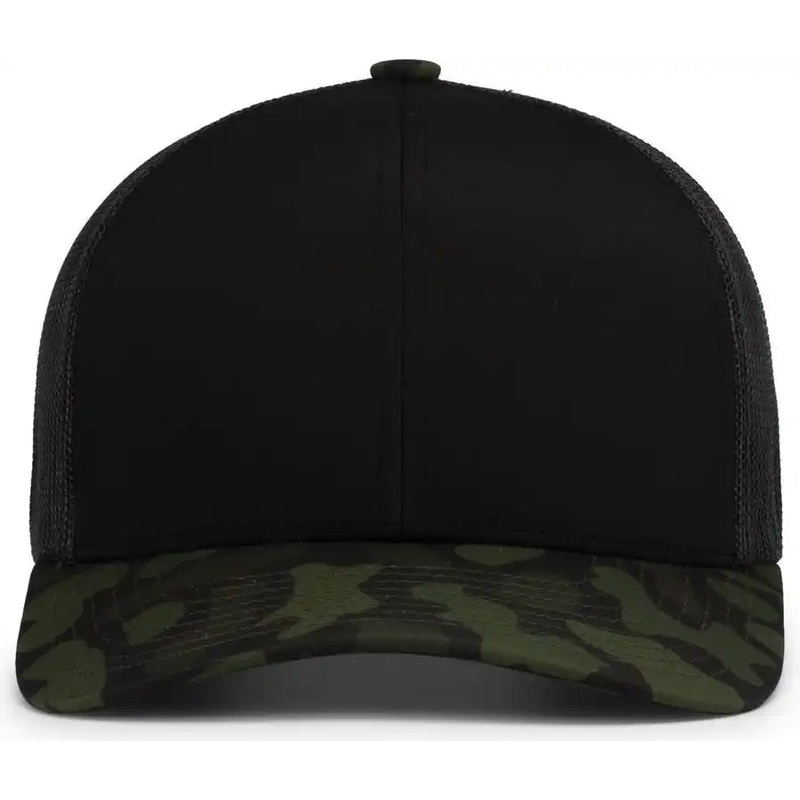 Pacific Headwear P686 DUCK CAMO TRUCKER SNAPBACK CAP – Black Lt Charcoal Woodland>